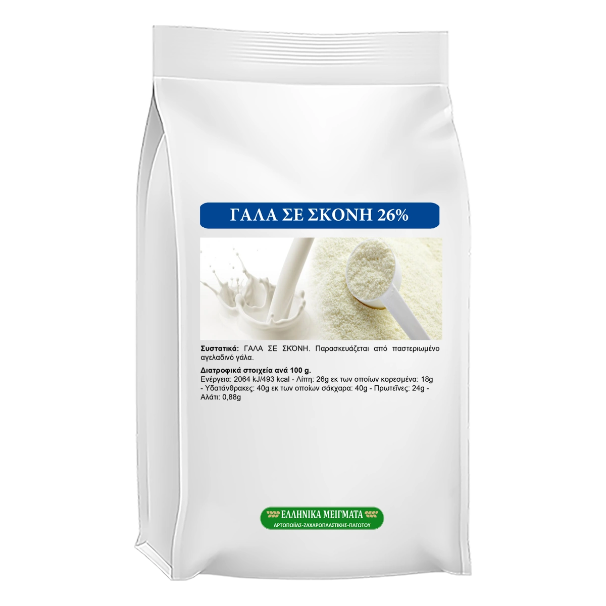 Πλήρες γάλα σε σκόνη με 26% λιπαρά, πλούσια γεύση και κρεμώδη υφή, ιδανικό για παγωτό, ζαχαροπλαστική και τυροκομικές εφαρμογές.