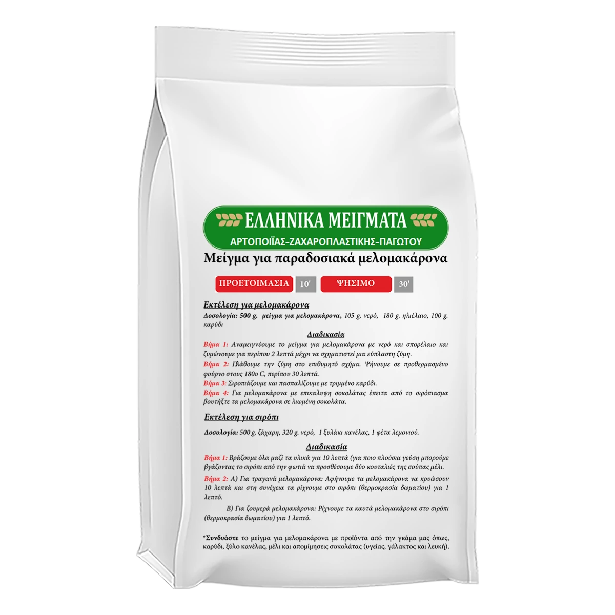 Επαγγελματικό μείγμα για την παρασκευή παραδοσιακών μελομακάρονων με πλούσια, αυθεντική γεύση και εξαιρετική δομή. Εξασφαλίζει σταθερό αποτέλεσμα, σωστή απορρόφηση σιροπιού και ομοιόμορφο ψήσιμο. Το τελικό προϊόν είναι αφράτο, αρωματικό και διατηρεί την υγρασία και τη φρεσκάδα του για μεγάλο χρονικό διάστημα.