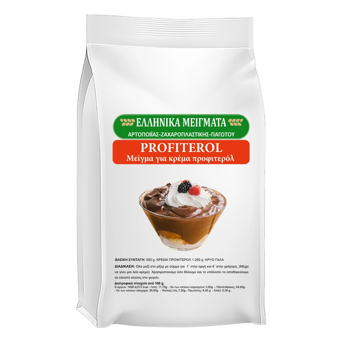 Μείγμα για την παρασκευή του κλασικού γαλλικού γλυκού προφιτερόλ (profiterole ή choux à la crème). Περιλαμβάνει ζύμη choux για αφράτες, χρυσοκαφέ μπάλες γεμιστές με κρέμα ζαχαροπλαστικής, προσφέροντας υπέροχη γεύση και μεταξένια, κρεμώδη υφή. Η κρέμα διατηρείται σταθερή στην κατάψυξη, ιδανική για σερβίρισμα ή παρουσίαση σε επιδόρπια και γλυκά. Γρήγορη και εύκολη παρασκευή για επαγγελματική ή οικιακή χρήση.