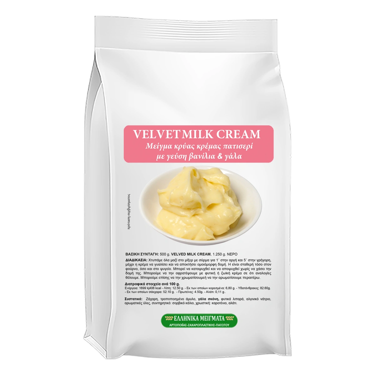 Το Velvet Milk είναι επαγγελματικό μείγμα για την παρασκευή κρύας κρέμας πατισερί με πλούσια γεύση pasticera και άρωμα βανίλιας, με χαρακτηριστικό χρυσοκίτρινο χρώμα.